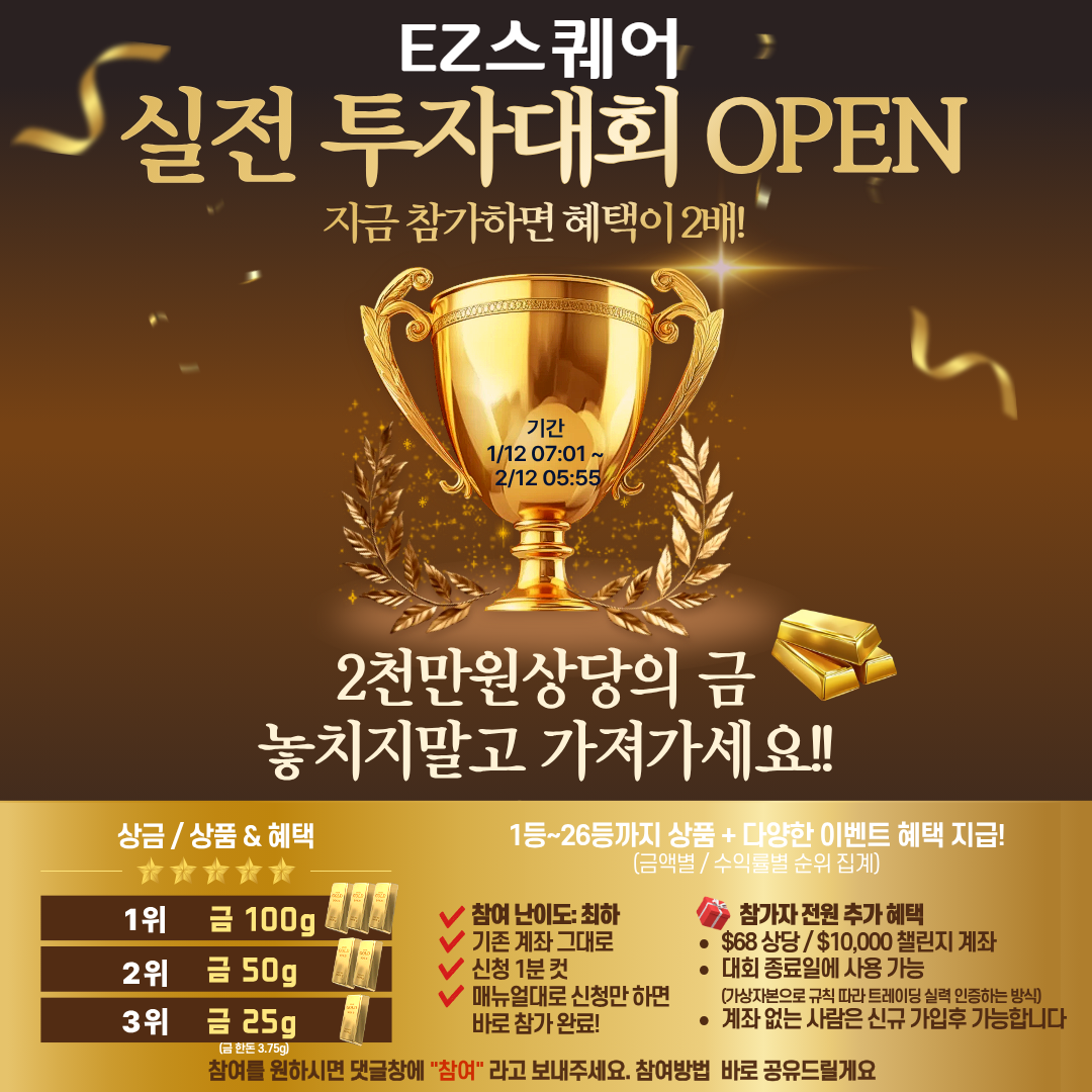 오늘 포스팅은,홍콩 항셍 지수 선물 투자 증거금 거래 시간 / 안전한 해외증권사에 대해서 알아보겠습니다. 해외선물 실전 투자대회가 열립니다!2천만 원 상당의 '금' 상품! 기회를 놓치지 마세요! ✅ 대회 기간2026년 1월 12일 ~ 2월 12일 ✅ 신청 방법기존 계좌 그대로 사용 가능계좌가 없는 분만 신규 가입 후, 참여 가능합니다.(신청은 1분이면 OK) ✅ 상금 1위 : 금 100g(약 26.7돈)2위 : 금 50g3위 : 금 25g 수익률별, 금액별 다양한 혜택이 있습니다.(1등부터 26등까지 상품 지급!) 참가자 전원에게 $68 상당의 $10,000 챌린지 계좌를 지급해 드립니다. ✅ 참여 방법카카오톡 링크를 통해 '참여'라고 보내주시면, 참여 방법 바로 공유해 드리겠습니다. 순서1...